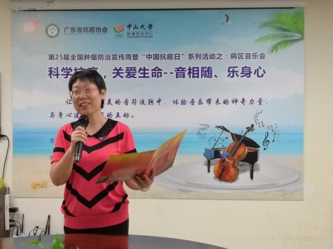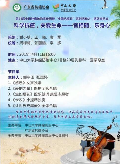 一行行乐谱,好似飘扬的彩带,点缀着人生的精彩;一个个音符,宛如闪烁的华灯,辉映着生活的美好。2019年4月11日下午,第25届全国肿瘤防治宣传周暨“中国抗癌日”系列活动之“病区音乐会”,在中山大学肿瘤防治中心乳腺科隆重举办。