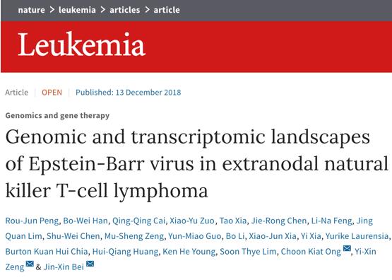 2018年12月13日,该研究以题为“结外NK/T细胞淋巴瘤中EB病毒基因组学与转录组学图谱”的研究成果被直接接受并快速在线发表在国际知名期刊《自然》子刊《白血病》(Leukemia,IF=10.023)上。