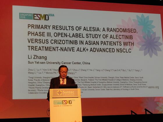 2018年 11 月 23 日-25 日,欧洲肿瘤内科学会亚洲年会 (ESMO ASIA)在新加坡盛大召开。24日上午举行的主席专场(Presidential Symposium),中心内科张力教授口头报道了亚裔ALK阳性非小细胞肺癌(NSCLC)III期alesia研究的主要结果。