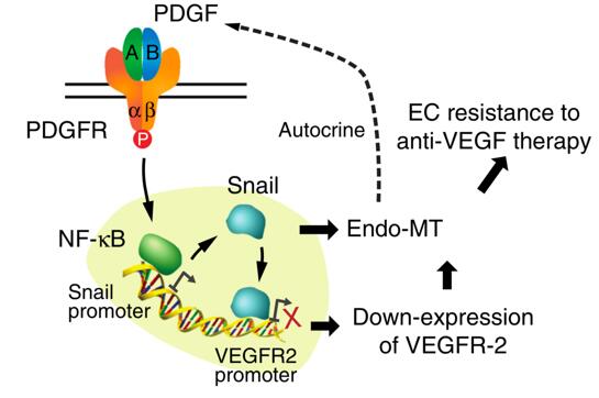 胶质母细胞瘤的血管生成异常丰富,对于胶质母细胞瘤的抗血管内皮生长因子治疗抵抗或者疗效不佳,其中必定存在某种机制。从2015年开始,牟永告教授团队、张振峰教授团队与宾夕法尼亚大学的Fan Yi教授团队合作研究胶质母细胞瘤抗血管内皮生长因子治疗抵抗的研究,我们发现在胶质母细胞瘤微环境中存在的肿瘤相关血管内皮细胞有明显的间质化的趋势,而间质化的血管内皮细胞主动下调了血管内皮生长因子受体-2(VEGFR-2)的表达,但同时又利用血小板源性生长因子受体激活后下游的信号通路来维持自己的间质化以及血管生成的能力,利用药物联合靶向血小板源性生长因子受体(VEGFR)和血小板源性生长因子受体(PDGFR)在小鼠原发胶质母细胞瘤模型上能够有效杀伤肿瘤并延长生存期,这项研究提示了联合靶向VEGFR和PDGFR的抗血管生成治疗有治疗胶质母细胞瘤的巨大潜力。