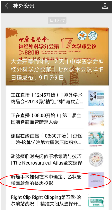 2018年8月26日,中国神经外科专业平台——神外资讯报道了我院神经外科陈忠平教授、牟永告主任,赛克副主任医师、张继医师在听神经瘤手术中的新认识,是对神经外科听瘤手术经典定位横窦、乙状窦的一个补充和完善,有极大的临床意义,得到了神经外科同行的高度赞誉。