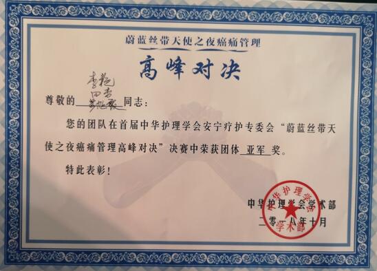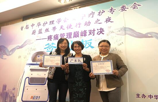 在镇痛周前夕,恰逢首届中华护理学会安宁疗护专委会举办“蔚蓝丝带天使之夜癌痛管理高峰对决”决赛。我院派出“2018广东省蔚蓝丝带天使行动癌痛全程管理护理技能大赛”一等奖获得者黄旭霞GPM护士,联合广东省人民医院GPM护士、广东省中医院肿瘤科护士长组成“广东代表队”,由辛明珠副主任带队、邹本燕护士长担任指导老师代表广东与来自全国共12个省的代表队同台竞技,并荣获团队亚军、GPM护士一等奖的好成绩,为我院镇痛周活动拉开序幕。