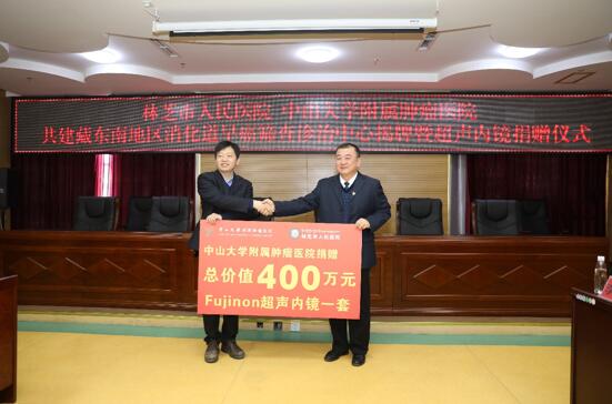 2017年11月,正是在林芝市人民医院 “创三甲”冲刺的关键时刻,中心武少新书记率党员专家医疗队走进雪域高原。在林芝市人民医院,武书记代表中心向林芝市人民医院捐赠价值400万元的超声内镜一套。自此,林芝市人民医院成为自治区内第一家拥有超声内镜的医院,向建设最先进的内镜中心迈出了坚实的一步。2017年11月11日,林芝市人民医院/中山大学附属肿瘤医院共建藏东南地区消化道早癌筛查诊治中心正式挂牌成立,标志着一流的内镜早诊早治技术落户林芝,将造福于藏东南地区群众。