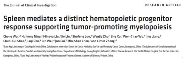 2018年8月1日,中心郑利民课题组在《Journal of Clinical Investigation》上发表了题为“Spleen mediates a distinct hematopoietic progenitor response supporting tumor-promoting myelopoiesis”的研究成果。该研究揭示了肿瘤可通过重新启动脾脏髓外造血,来产生具有更强免疫抑制功能的髓系细胞,进而促进疾病进展;并鉴定出其中的关键造血干/前体细胞亚群与调控机制。中山大学肿瘤防治中心2011级直博生吴翀为论文的第一作者。