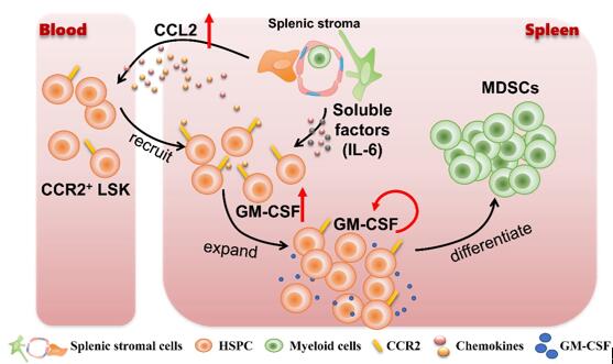在正常成体哺乳动物中,造血活动(包括髓系细胞生成)主要发生在骨髓,而脾脏仅在胚胎发育早期有造血功能。但该研究发现:在肿瘤影响下,骨髓外的造血活动发生了比骨髓更加显著的改变;而脾脏是肿瘤引起髓外造血(EMH)的主要场所,并呈现出明显的髓系细胞生成偏向。更有意思的是:荷瘤宿主脾脏的LSK细胞(即处于造血系统中最顶端的HSPC群体)具有独特的功能表型(GM-CSF+ LSK),并可产生具有更强免疫抑制功能的MDSC。说明:脾脏造血不仅仅是对骨髓造血在数量上的补充,还可显著影响髓系细胞的免疫特性。