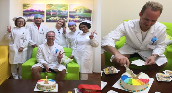 5月17日,在我中心的实践期间,刚好是实习生之一Andreas的生日,细心的总带教刘玉老师悄悄地为他订了生日蛋糕,令远离家乡的Andreas意外和惊讶不已。护理部辛主任、导管门诊李佳、林细铃等老师专门在心理小组工作室“悠然阁”为Andreas组织了一个小小的生日Party,几位留学生和老师们一起为Andreas唱了中文版、英文版以及粤语版的生日祝福歌,让Andreas非常感动。