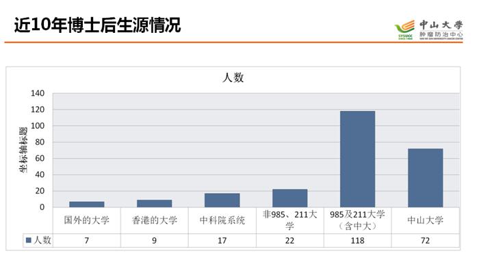 目前我中心在站博士后为95人,近10年博士后进站总数为173人,主要研究学科为肿瘤基础研究、肿瘤药物研究以及肿瘤临床应用研究等。