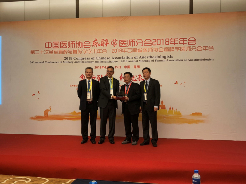 颁奖礼上,美国麻醉学杂志主编Evan D. Kharasch 教授(左二),中国医师协会麻醉医师分会会长、中国人民解放军总医院麻醉手术中心主任米卫东教授(左一),中国医师协会麻醉医师分会前任会长、上海交通大学医学院附属仁济医院麻醉科主任俞卫锋(右一)一起为曾维安教授进行授奖。