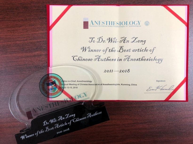 美国麻醉学杂志 (Anesthesiology) 是麻醉专业的顶级杂志,本次奖项是根据2011年到2018年刊登在杂志中,中国作者文章被引用次数最高的三篇文章评选。该文章共被引用132次,是2011年至2018年被引用最高的文章。此文章还被收录至美国麻醉学继续医学教育项目 (Anesthesiology CME Program) 教材。