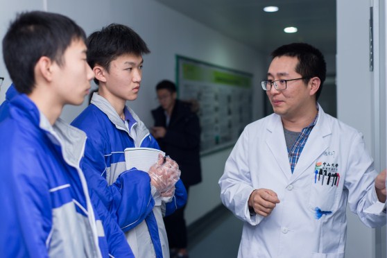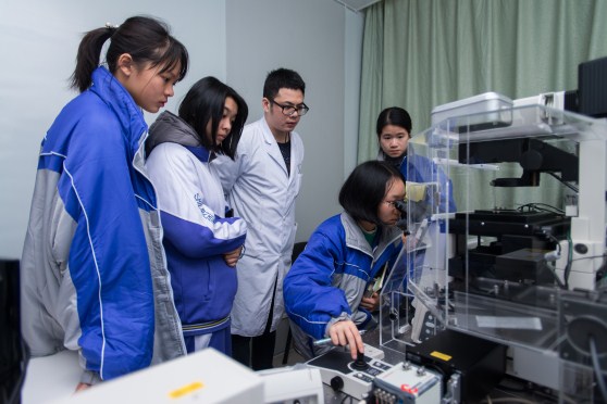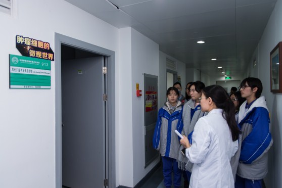 随后,师生们分为了10个小组,每个组由一位助研老师全程带队,参观了中心各课题组的实验室,并有10位博士研究生和技术员驻点为大家讲解肿瘤科研中所使用的各种手段和仪器。在工作人员热情耐心地讲解下,同学们了解了怎样解秘肿瘤细胞及一些大型仪器的功能和使用,工作人员还在现场为大家演示了肿瘤细胞超微世界等实验技术。通过工作人员专业的讲解和演示,学生们对肿瘤知识、科学研究等都表现出了浓厚的兴趣,师生们认真观摩了如何识别捕获肿瘤细胞的演示后,又逐一在荧光显微镜下观察了肿瘤细胞和正常细胞的异同,并提出了许多自己感兴趣的问题与研究生和科研工作者交流学习。参观活动也让师生们纷纷感叹如今肿瘤医学研究的奇妙,更有同学表示高考填报志愿会选择医学和生物学方向。