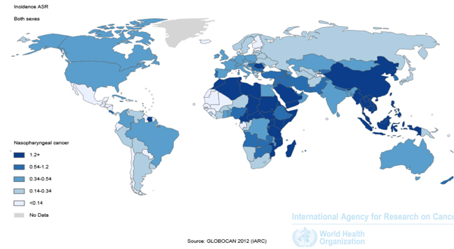 鼻咽癌发病率世界地图显示中国发病最高(数据来源www.iarc.fr)