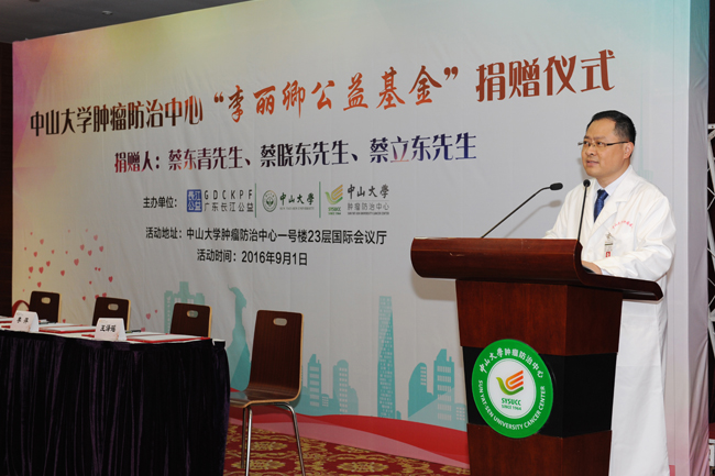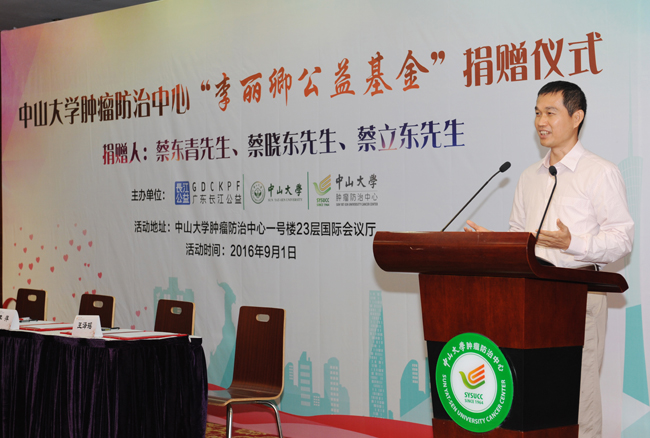 中心主任、院长徐瑞华教授衷心感谢蔡氏三兄弟及广东省长江公益基金会对我中心事业发展的关心和支持。他提到,“李丽卿公益基金”将激励我中心的医务人员不辱使命,以实际行动践行中山先生“为社会福,为邦家光”的谆谆教导,在医疗科研的道路上攻坚克难,传递三位蔡先生及长江公益基金会的大爱精神,为建设健康中国贡献力量。我中心将在人才梯队搭建完成的基础上构筑人才高地,培育肿瘤医学协同创新中心并筹建肿瘤精准医学研究平台,以转化医学研究为纽带,结合“三个面向”的指引,实施肿瘤防诊治领域的科技攻关;进一步强化单病种多学科规范化诊疗,提升医疗质量,占领医疗技术高地,践行人文医疗服务,在扩大中大肿瘤医疗品牌影响力的同时造福社会;为社会输送具有“德才兼备、领袖气质、家国情怀”的肿瘤学高层次创新型及应用型人才。