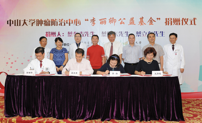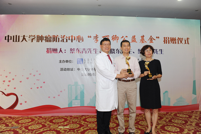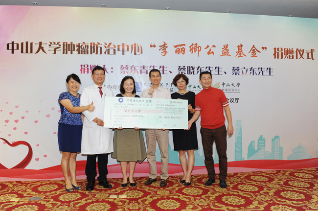 广东省优秀企业家蔡东青先生、蔡晓东先生、蔡立东先生通过广东省长江公益基金会向中山大学教育发展基金会无偿捐赠人民币两仟万元,命名为“李丽卿公益基金”,用于中山大学肿瘤防治中心优秀人才的培养以及医疗科研事业,具体包括:医务人员出国深造资助及高层次人才项目获得者奖励、医疗科研项目资助等。以期加快肿瘤防治中心实施人才强院战略,造就高层次创新人才队伍,推动中心创新驱动战略的实施。