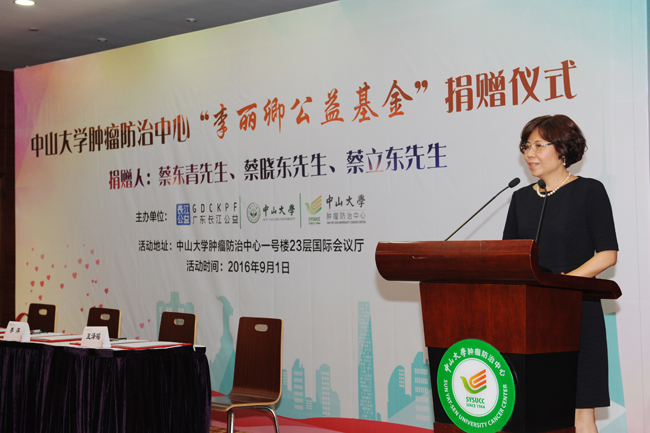 长江公益基金会会长王泽瑶女士也做了充满激情的致辞。她说,捐赠人蔡氏兄弟是有思想有担当的企业家,心存高远,心系大众。中山大学是一所有情怀的大学,中大肿瘤防治中心在肿瘤学专科领域的医疗技术实力和服务水平更是得到各界的高度认可,基于这种高度认可,奥飞娱乐蔡氏兄弟此次设立“李丽卿公益基金” 支持人才菁英计划和医疗科研项目,反映了蔡氏兄弟对中山大学肿瘤防治中心高新人才的殷切期望,希望医学界的新楚能够始终保持拳拳赤子心,不遗余力建设健康中国。