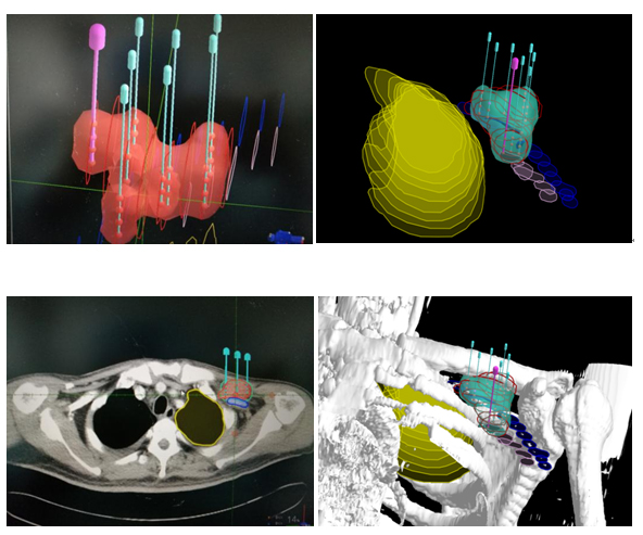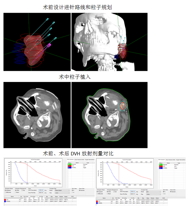 如何在胸壁和面颊部找到合理的穿刺路径,精准的排布125I粒子,减少穿刺次数和避开血管等重要脏器,是此次治疗的难点问题。在北京启麟科技有限公司的帮助下,采用的3D建模的方法,通过粒子植入计划系统将患者肿瘤CT扫描图像进行三维重建,完整的呈现出患者皮肤、血管和肿瘤之间的关系。设计出每一根穿刺针的针道、进针深度、粒子分布及粒子数量、肿瘤受辐射的剂量,最后通过3D打印设备制作出贴合患者皮肤的微创导向模板,模板上打印出每一根针道的方向。经过张福君教授,高飞副教授及其团队的密切配合,再次成功为2名患者实施了CT引导下微创导向模板辅助下的125I粒子植入,术后对粒子的分布作出剂量分析,完全符合术前的组织计划剂量。