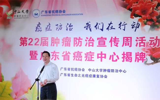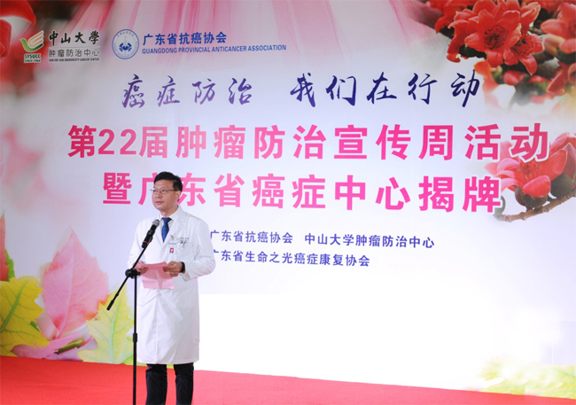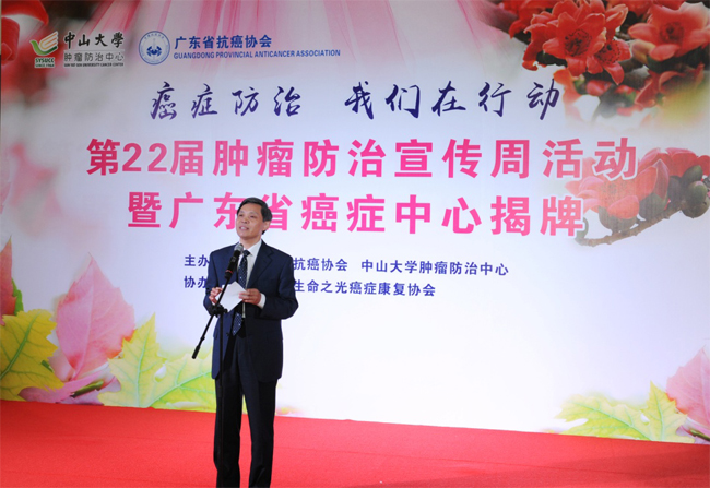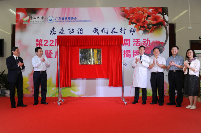 4月15日上午,中心和广东省抗癌协会携手举办的肿瘤防治宣传周活动正式启动。广东省卫计委主任陈元胜、副主任黄飞,国家癌症中心副主任王明荣,广东省疾控中心副主任杨杏芬,中山大学副校长余敏斌与中大肿瘤防治中心领导班子共同为广东省癌症中心成立揭牌。