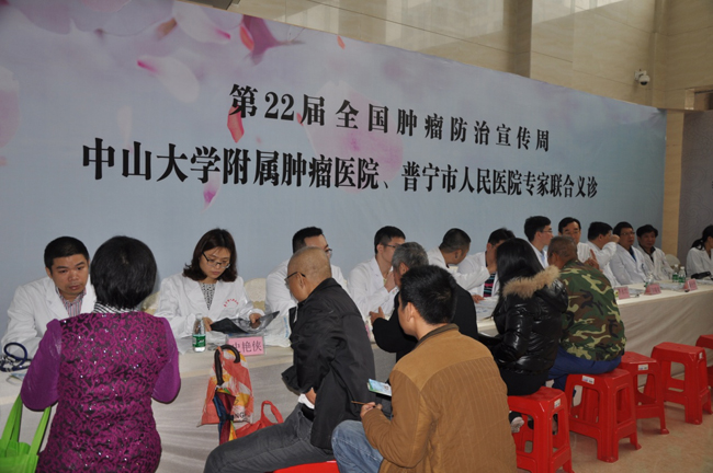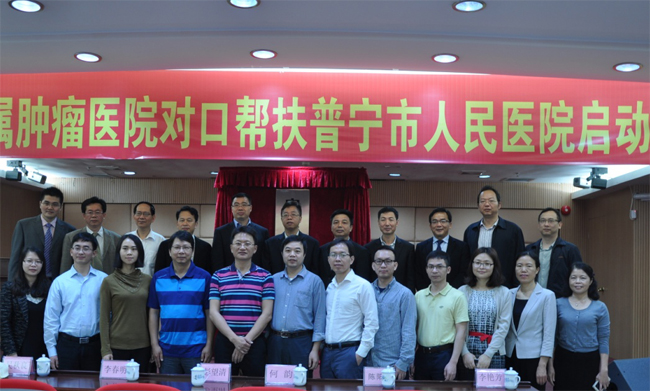 2016年4月15-17日,在中心党委副书记彭望清、院长助理、医务处处长何韵率领医疗队一行15人前往普宁市人民医院开展全国肿瘤防治宣传周活动暨对口帮扶活动。进行了肿瘤防治宣传、对口帮扶揭牌启动仪式、座谈、专题讲座、MDT多学科联合会诊、教学查房、手术指导、义诊等一系列活动,本次活动取得圆满成功。