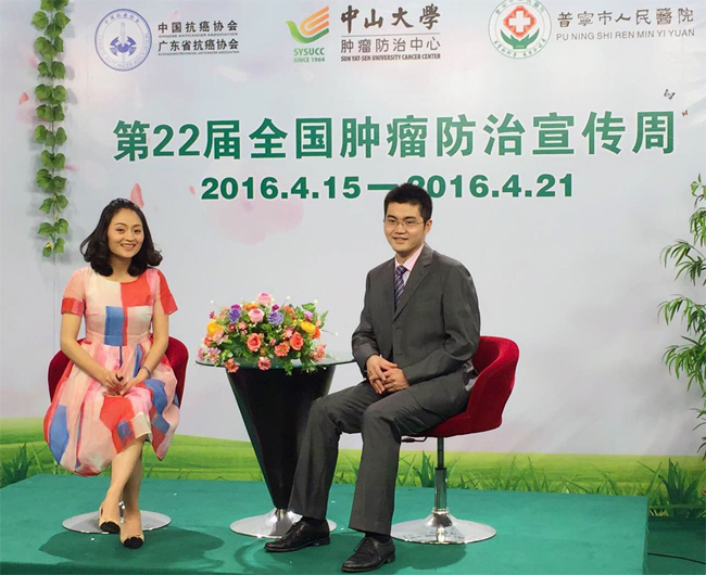 我院泌尿科董培博士,目前挂职普宁市人民医院副院长(右),在普宁市电视台做防癌健康专题宣讲。