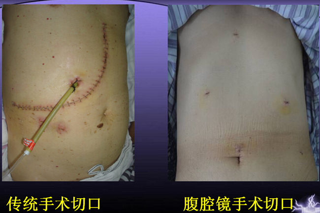 图1. 传统肝切除术的巨大切口vs. 腹腔镜手术微创切口
