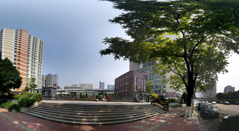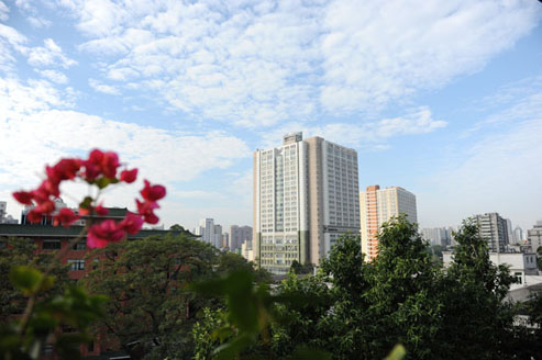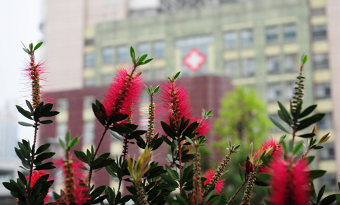 映日的红花点缀着彼此的笑容,遮天的大树荫护着整洁的院区。