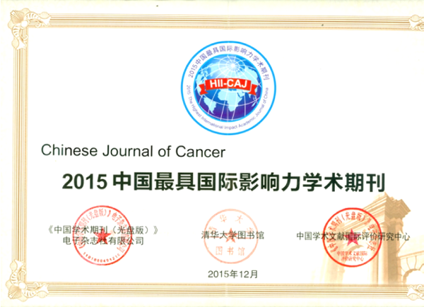 2015年12月18日,由中国期刊协会、中国科学技术期刊编辑学会、中国高校科技期刊研究会、全国高等学校文科学报研究会、中国学术期刊(光盘版)电子杂志社有限责任公司5家单位联合主办、同方知网承办的“中国学术期刊未来论坛”在北京九华山庄隆重举行。中国学术期刊(光盘版)电子杂志社有限责任公司和清华大学图书馆在会上联合发布了《2015中国学术期刊国际引证年报》,Chinese Journal of Cancer再次入选“中国最具国际影响力学术期刊”,这是Chinese Journal of Cancer 连续三年获此称号。“中国最具国际影响力学术期刊”是基于期刊国际影响力指数CL,从全国6306种科技期刊中选出的TOP 5%期刊。