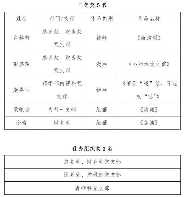 面包屑 首页 / 新闻中心 / 中心通告 “廉洁校园(医院),筑梦同行”廉洁文化作品评选结果公示 2021-01-19 根据中心《关于举办“廉洁校园(医院),筑梦同行”廉洁文化作品征集活动的通知》,经各党支部、个人投稿,纪委办公室组织评审,现将评选结果予以公示: 以上获奖结果公示3天 如有异议联系:纪委办公室 电话:87342190 上一篇 下一篇 分享 最新动态