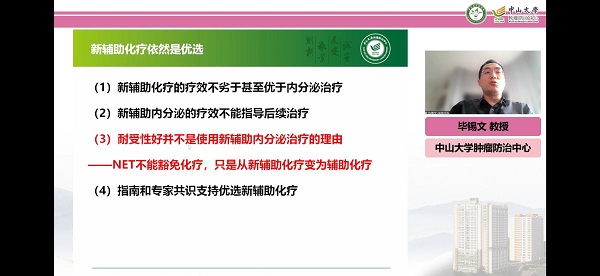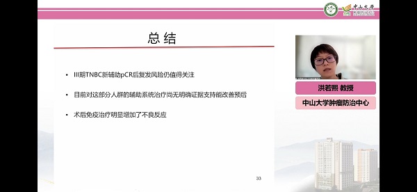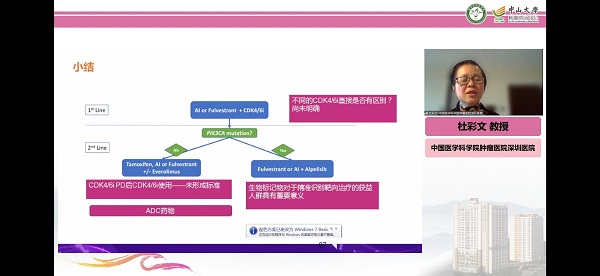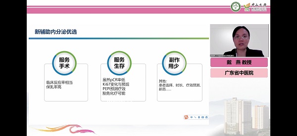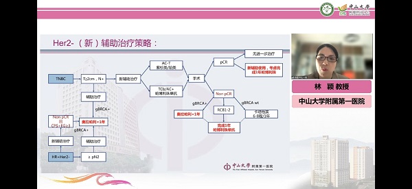 会议的第三单元首先由中山大学附属第一医院的林颖教授针对gBRCA致病突变的HER2-乳腺癌,分析了PARP抑制剂与免疫治疗的使用选择,优化了mBRCA+乳腺癌的新辅助/辅助方案。中山大学肿瘤防治中心的林焕新教授、史艳侠教授,中科院肿瘤医院深圳医院的杜彩文教授,则对乳腺癌的放疗、内分泌治疗等的治疗进展提出了自己的总结与思考。