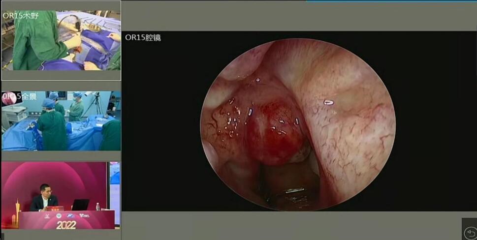 大会第二天为手术实战环节。由广州医科大学附属第五医院张建中教授、广州中医药大学附属第一医院王顺兰教授、中山大学肿瘤防治中心华贻军教授分别担任会议主持,陈明远教授主刀,对3例复发鼻咽癌患者行鼻内镜根治手术。大会对陈明远教授手术进行全程同步直播,陈教授亲自讲解,向线上线下参会嘉宾形象生动地展示了鼻内镜手术中按肿瘤学外科原则的整块切除技巧、“包饺子”切除和鼻咽全粘膜剥离理念及手法、带血管蒂鼻腔粘骨膜瓣修复技术、无血切除及免拔除填塞方法等系列鼻咽癌内镜手术技巧、术式及规范。