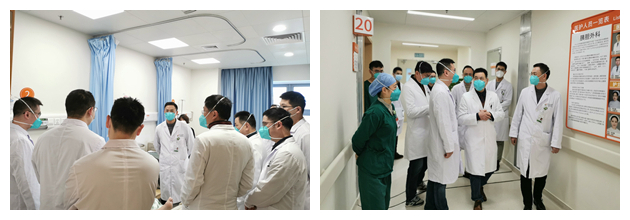 李升平主任、劳向明教授、林小军教授、崔伯康教授、韩远霞护士长带着全科医护人员一早过来查房,认真仔细询问每一位患者的病情,特殊患者做好特别嘱咐,重点患者重点交班,同时为他们加油打气,保证在院的患者有序、安全完成治疗及护理,过个平安祥和幸福年。