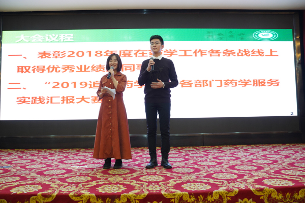 大会共分为两部分,一是对各岗位上取得优秀业绩的药师们进行表彰,二是各部门以舞台剧形式进行药学实践汇报。大会伊始,刘韬副主任首先上台对大家过去一年的辛勤付出表示诚挚的感谢,并致以新春的祝福。随后,激动人心的表彰大会在何欣药师和黄焱药师的主持下拉开帷幕。
