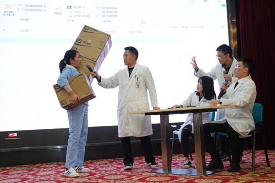 “忙碌总是没昼夜……配药疾走的汗水,浸湿着我额头……平凡忙碌的工作后,是药师誓言的坚守……”首先登场的是委托培训的药师们,一首《药师之歌》悠扬地唱出了多少药学追梦人的心声,引起了大家强烈共鸣。紧接着画风一变,中心药房的《寻药追踪》则幽默、夸张地演绎了追踪发药差错的全过程,炸裂的演技、跌宕的剧情,引得台下笑声不断,掌声连连,在欢声笑语中传达出药师的工作必须专心致志,一丝不苟。随后,中药房的药师们化身“药神”卖起了保健品,搞笑的情节、别致的造型生动地再现了大爷大妈们买保健品的情形,逗得台下捧腹大笑,展现了药师在科普宣教中的表现功力。