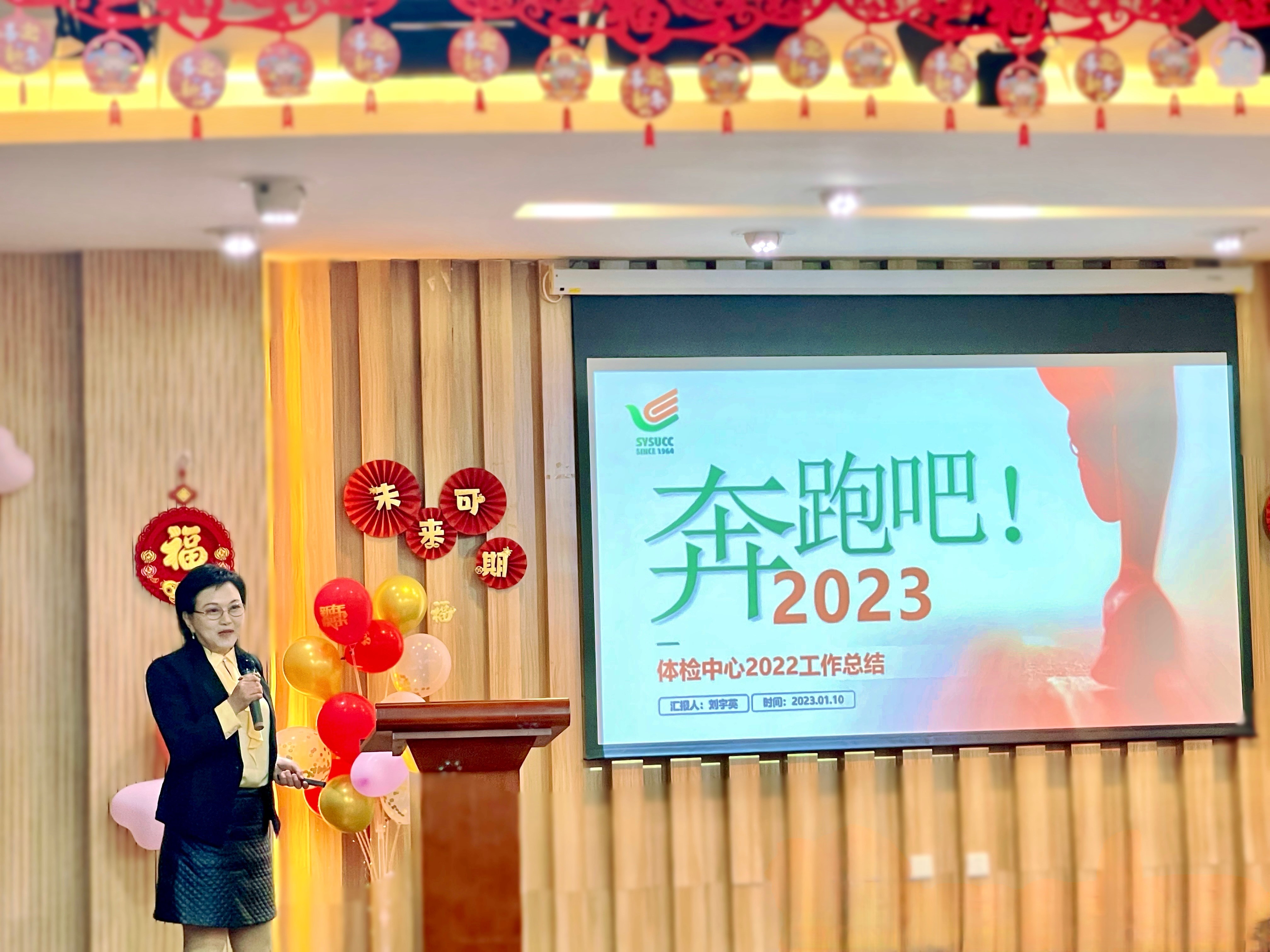 接着,体检中心主任刘宇英以“奔跑吧,2023”为主题,向大家做了2022年度工作总结,2022年,体检中心成立十周年,十年间栉风沐雨、筚路蓝缕,体检中心由弱到强,业务量实现倍增式增长。2022年在院领导和全院职工的支持下,体检中心在医教研、护理等方面都取得了一定的突破。在疫情期间,体检人数稳中有升,全年完成体检人次稳中有增,筛查出疑似恶性肿瘤最后确诊86.9%为早期癌。多次响应医院、政府号召参加核酸采样队,为多家省直单位上门接种新冠疫苗,全力打好疫情防控攻坚战;同时圆满完成省委保健工作;在科研方面,获广东省医学科研基金一项,发表多篇高水平论文。全员积极参与三甲复审迎评工作,并顺利通过。体检中心成功举办“2022肿瘤预防与筛查策略新进展研讨会暨中肿防癌体检健康管理中心成立10周年总结会”,荣获市级“青年文明号”。2023年,站在新的起点,体检中心全体职工将继续优化体检流程,突破B超、CT检查方面的瓶颈,保证体检业务量的同时提高服务质量。并立足于中心三院区发展的新格局,提升服务能力。