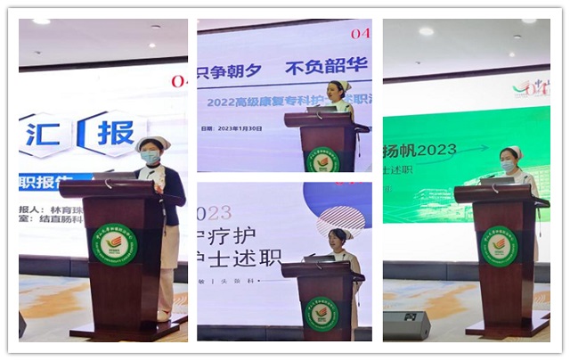 首先,四位专科护士代表汇报所做的专科护理工作。个案管理专科护士林育珠从岗位认知,已取得成效,工作设想,展望与思考进行了汇报,讲述了年轻新发肠癌年轻患者面临更严俊的挑战,后续工作将致力于年轻肠癌患者的研究,以更好服务患者;高级康复专科护士康璐分享了学习实践的经历、专科护理工作进展及规划了从医院、科室、个人等三方面的工作展望,包括完善革新患者快速康复流程制度、健康教育及落实全病种、全年龄段的快速康复病房,协助护士长完善快康的精准系统;营养专科护士洪宇彤从医教研三方面总结了2022年的工作成果,并对今年的工作重点进行了分享;安宁疗护专科护士李敏从岗位认知、工作汇报及专科护理工作开展设想等方面进行了汇报。