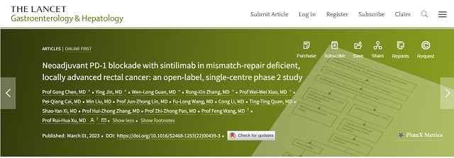 近日,中山大学肿瘤防治中心徐瑞华、王峰、陈功消化系统肿瘤团队在国际顶级杂志、柳叶刀子刊《The Lancet Gastroenterology & Hepatology》在线发表了信迪利单抗用于错配修复缺陷的局部晚期直肠癌新辅助治疗的II期临床研究结果。该研究发现在错配修复缺陷(dMMR)或高度微卫星不稳定(MSI-H)局部晚期直肠癌中,通过程序性死亡蛋白-1(Programmed Death-1,PD-1)抗体治疗后,大部分患者能够达到临床完全缓解,避免放化疗及手术治疗的损伤。该结果为免疫治疗在错配修复缺陷或高度微卫星不稳定(dMMR/MSI-H)局部晚期直肠癌的应用提供了新的有力证据。