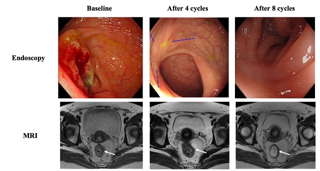 研究共入组了17例初诊dMMR/MSI-H局部晚期直肠癌患者,在16例可评估疗效的患者中有15例的肿瘤在治疗后缩小。其中,6例患者接受了根治性手术,有3例达到病理完全缓解;9例患者达到临床完全缓解并选择了随访观察,从而避免了放化疗及手术的损伤;1例患者因不良反应提前终止治疗。研究总的完全缓解率高达75%。此外,本研究中患者达到临床完全缓解的中位时间为5.2个月,提示和传统的新辅助放化疗相比,免疫治疗可能需要较长的时间才能达到最佳疗效。在毒副作用方面,观察到的不良反应大多数为1-2级,仅发生1例3级以上不良事件。这组病人随访到2022年11月,均未出现肿瘤复发。