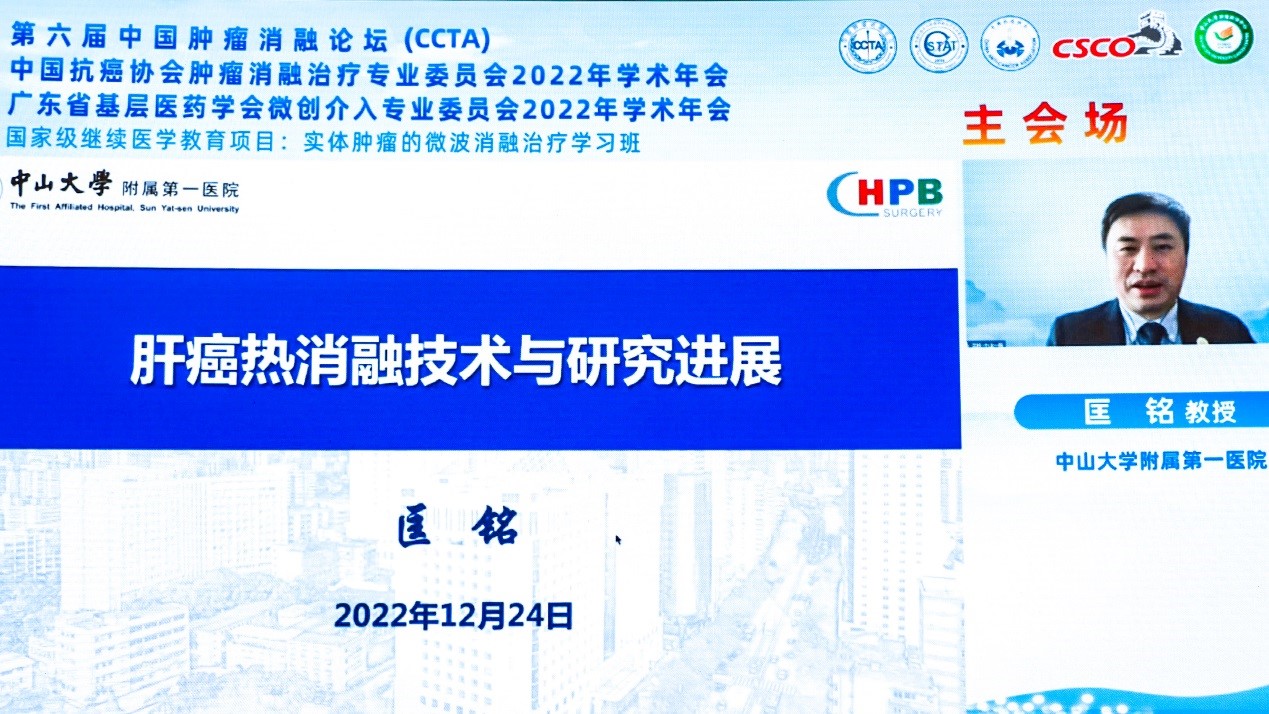 2022年12月24-25日,由中国抗癌协会肿瘤消融治疗专业委员会、中国临床肿瘤学会(CSCO)肿瘤消融专家委员会、中国医师协会介入医师分会肿瘤消融治疗专业委员会、中国医师协会超声介入专业委员会、广东省基层医药学会微创介入专业委员会等联合主办的“第六届中国肿瘤消融论(CCTA)、中国抗癌协会肿瘤消融治疗专业委员会2022年学术年会、广东省基层医药学会微创介入专业委员会2022年学术年会”正式召开。大会开幕式由中国抗癌协会肿瘤消融治疗专委会主任委员、中山大学肿瘤防治中心微创介入治疗科主任范卫君主持。