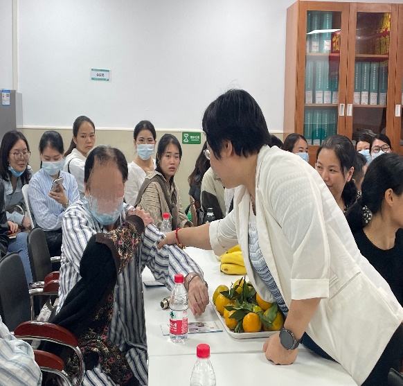 临床上,老年肿瘤患者因机体老龄化、基础共病的问题,往往认为疼痛是正常的。在第一个科普环节,疼痛护理小组黄旭霞主管护师用通俗易懂的话语解释了为什么肿瘤会痛、怎么正确认识疼痛以及怎么去和医生、护士和家属共同在医院和家里面对疼痛诊疗和照护问题。黄旭霞主管护师一直向现场的叔叔阿姨强调,无痛是每个人的基本权利,无论是患者还是家属都要知道疼痛无需忍,也不用忍,疼痛可以通过规范化的综合诊治得到患者,“远离疼痛、乐享生活”才是我们努力的目标。黄旭霞主管护师亲切的话语和专业的知识得到了现场患者及家属的赞许。