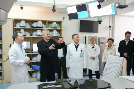 在徐瑞华院长、武少新书记的陪同下,陈春声书记一行首先走访了放射治疗中心,放疗科党总支书记、副主任高远红介绍了2023年放疗科的发展情况。陈春声书记实地考察了8号治疗机房,仔细询问了设备运行情况。该机房装备了华南地区首台国产CT一体化直线加速器,这台设备可执行一站式放射治疗,实现大型医疗设备装备国产化,为肿瘤患者带来了更为优质的医疗服务。
