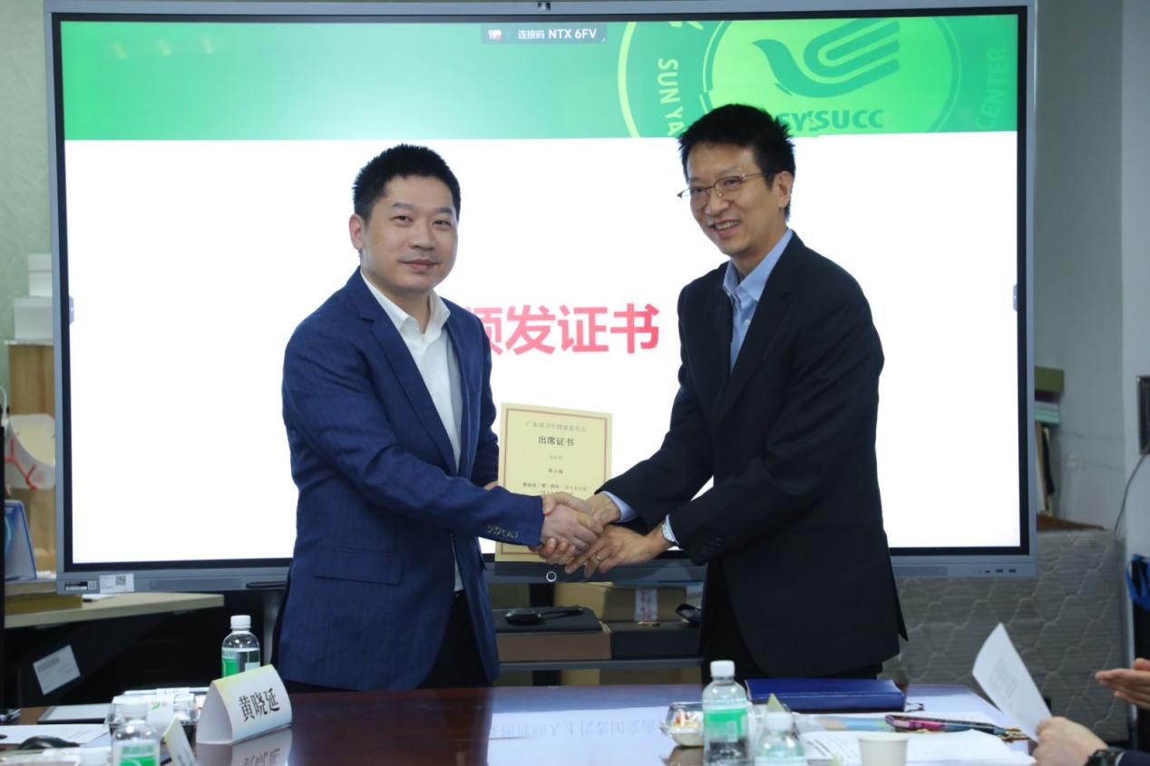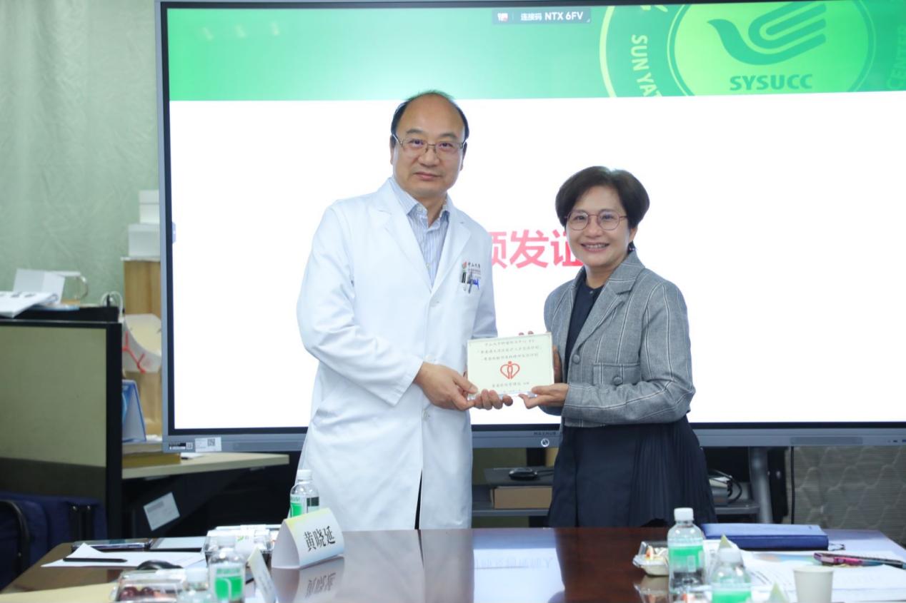 广东省卫生健康委员会交流合作处陈全处长向香港代表团颁发了证书。同时,香港医院管理局专职医疗部总行政经理潘绮红对中山大学肿瘤防治中心放疗科的支持表示诚挚的感谢,并赠送了一块奖杯以表达谢意。