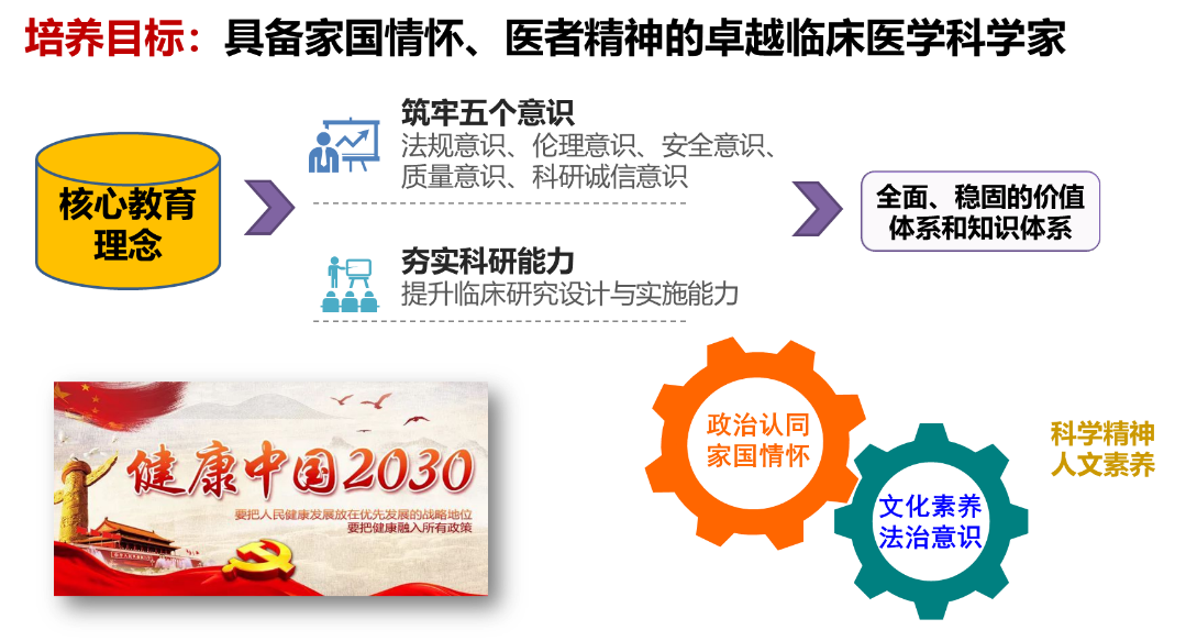 在课程理念方面:严格落实立德树人根本任务,以筑牢五个意识(法规意识、伦理意识、安全意识、质量意识、科研诚信意识)、夯实科研能力”为核心教育理念,培养医学生科学设计、准确测量、审慎评价的能力与素养。