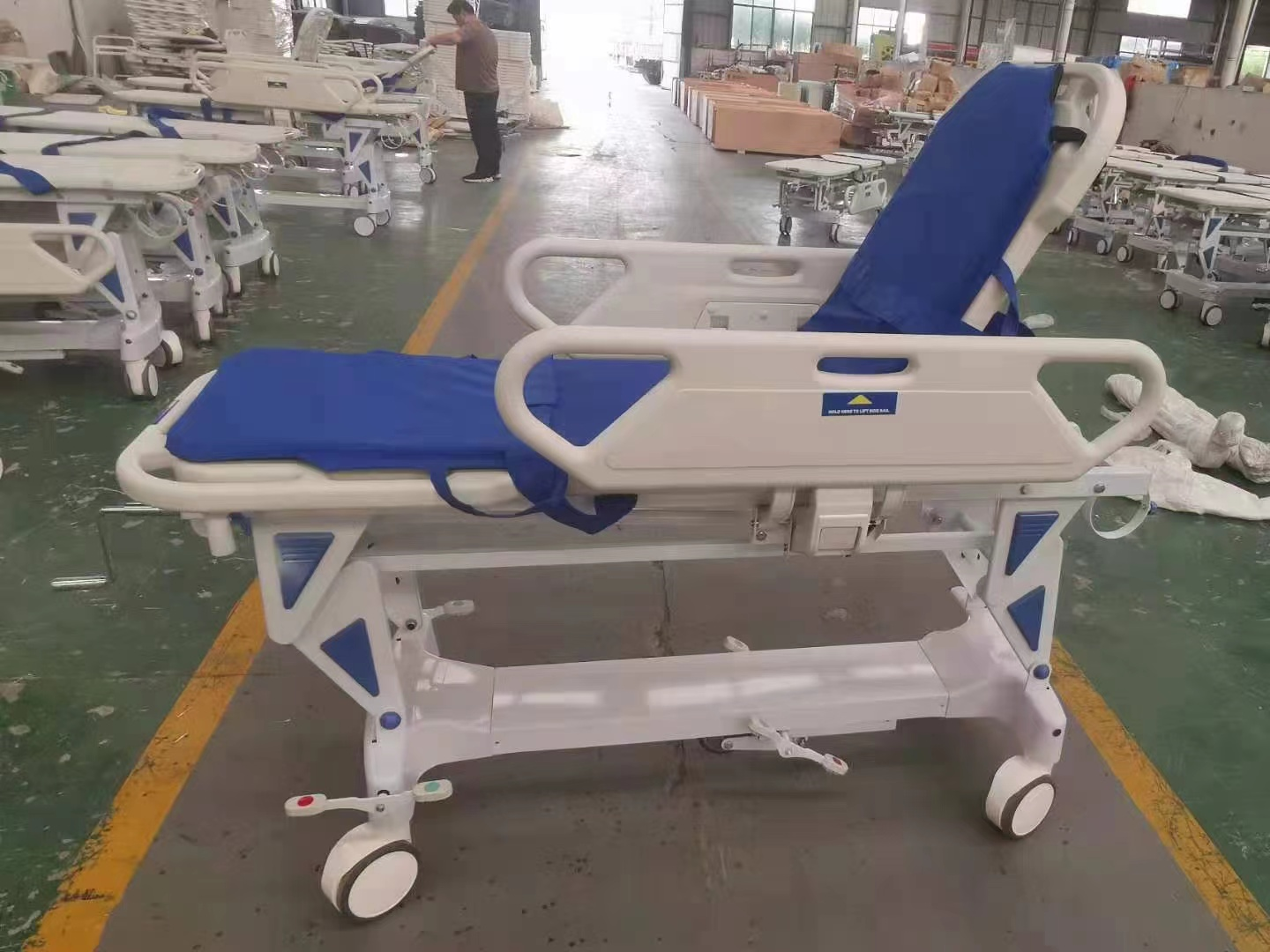 1.最大承载重量不小于200kg; 2.可折叠式摇杆,用于调节床体升降高度,有到位极限保护装置; 3.头部床面最大倾斜角度为80±5°; 4.单页式ABS护栏,护栏转动柄上有暗开关控制上升下降,护栏下降收缩时与床面平齐; 5.床面板有透气孔,前后有四个弧形推手洞; 6.床面中部为软连接床面; 7.配有2个点滴架插孔,1支伸缩输液杆; 8.工字型加重底架; 9.床面头部下方有氧气瓶固定座; 10.床脚为静音万向轮,带中控刹车装置。 |