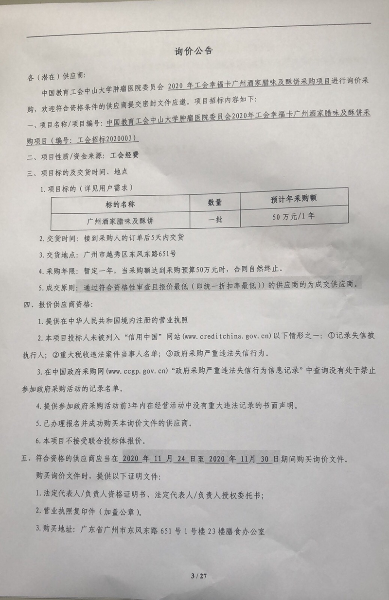 2020年工会幸福卡广州酒家腊味及酥饼采购项目询价公告