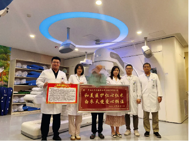 有一天,王阿叔早早来到了放疗中心,他的手里拿着一个大大的塑封好的“礼物”。“送给你们!”王阿叔把“礼物”放到门口,没等治疗师们反应过来,阿叔就拆开了塑封,里面是一块红底银边的牌匾和一封感谢信。