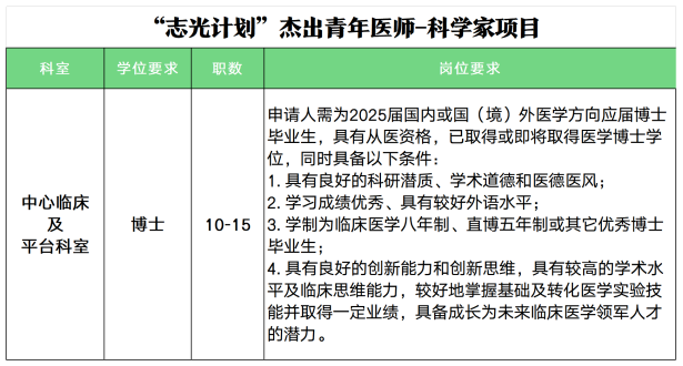面包屑 首页 / 新闻中心 / 中心新闻 中山大学肿瘤防治中心2025年招聘启事 2024-11-06 中肿2025年度招聘全面启动 欢迎热爱挑战、追求卓越的你 对医疗事业怀揣热忱与憧憬 对科技创新展现激情与投入 对未知世界充满好奇与探索 加入中肿,我们一起让梦想照进现实 中心医师岗位、"志光计划"岗位均为 “定岗”临床博士后岗位 完成博士后培养,达到出站要求后即可留院工作 定岗 定岗 定岗 上一篇 下一篇 分享 最新动态