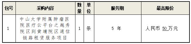 中山大学附属肿瘤医院医疗云平台之越秀院区到黄埔院区通信链路租赁服务项目进行公开招标,欢迎符合资格条件的投标人投标。项目招标内容如下: