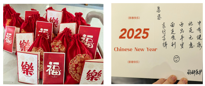 写新年贺卡时,医护们一笔一划,认真斟酌每一个词句,有的回忆着与病友相处的点滴暖心瞬间,有的则用最质朴的语言表达对病友康复的期盼。当他们将福袋送到病友和家属手中时,不少病友眼中闪烁着感动的泪花。一位病友激动地说:“原本以为在医院过年会很孤单,没想到能收到这么贴心的礼物,真的太感谢你们了!”