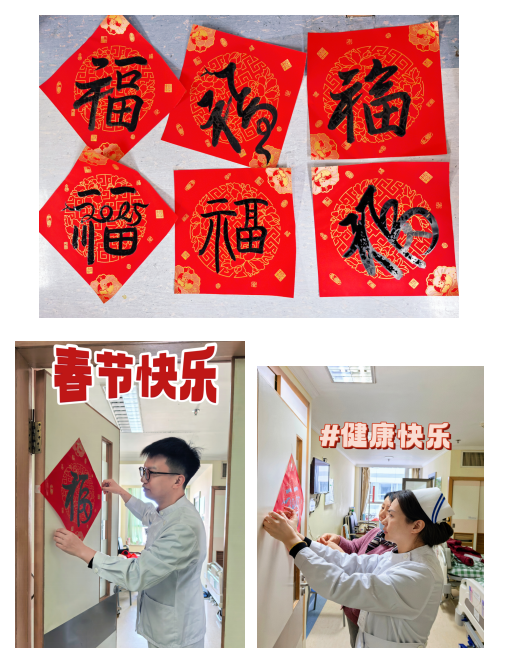 随后,一场别开生面的写“福”字和对联活动拉开帷幕。活动现场,医护人员早早布置好了红红火火的新年场景,准备好了笔墨纸砚,整齐地摆放着。病友们虽然身体状况各异,但在医护人员的鼓励下,都积极参与。
