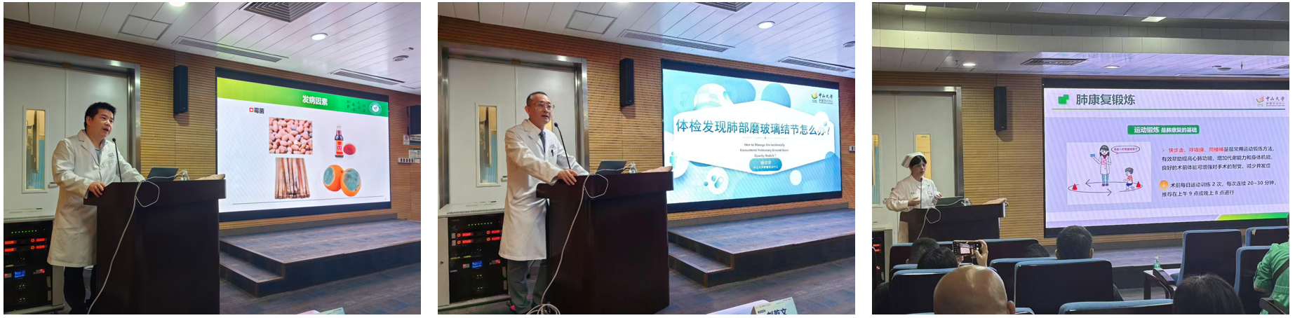 在科普讲座环节,杨浩贤教授带来肺部磨玻璃结节相关的基本知识,指出磨玻璃结节并不可怕,不必过度焦虑,但需科学管理。刘乾文主任医师科普了食管癌的防治知识,早期发现依赖于胃镜检查,高风险人群应定期进行筛查。钟就娣护士长则分享了胸部肿瘤患者康复的要点。专家们用通俗易懂的语言,将复杂的医学知识转化为患者和家属能轻松理解的实用内容。