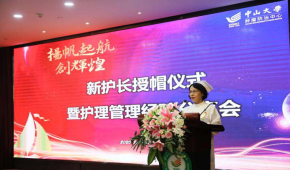 护理部召开新护长授帽仪式暨护理管理经验分享会随着中心业务科室科区护士长管理换届工作的完成,护理部也诞生了新一届的护理管理团队。8月31日,为了传承中肿优质护理的管理及服务理念,增加新护长们的职业荣誉感和使命感,护理部在23层国际会议厅举办了简单而庄重的“新护长授帽仪式暨护理管理经验分享会”,会议由辛明珠副主任主持。 辛明珠副主任主持会议 传承创新:新任护长的授帽仪式 首先进行的是新任护长的授帽仪式。首先由护理部覃惠英主任为黄埔院区护理部副主任刘莉授帽;接着由覃惠英主任、辛明珠副主任、吴剑辉副主任、刘莉副主任同时为新上任的科护长们、区护长们分批进行了授帽。值得一提的是,这次换届后首次产生了两位男护09-082020