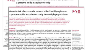 中肿团队再次在NK/T淋巴瘤遗传学研究获得突破由中山大学肿瘤防治中心牵头,联合来自全国九省/直辖市和港澳台地区、新加坡、韩国、美国等多家机构,组成国际研究团队,再次发现结外自然杀伤/T细胞淋巴瘤(简称“NK/T淋巴瘤”)的重要易感基因,揭示其重要致病机制,并提出潜在的肿瘤防治策略。2019年12月24日,中肿研究团队关于遗传学研究揭示NK/T淋巴瘤发病机制相关研究成果在线发表于国际顶级医学杂志《柳叶刀.肿瘤学》(Lancet Oncology)。中山大学肿瘤防治中心林国旺博士生和黄慧强教授为第一作者,林东昕院士和贝锦新研究员是项目指导者,贝锦新研究员是论文通讯作者。 这是该研究团队针对NK/T淋巴瘤3年内连续在《柳12-262019